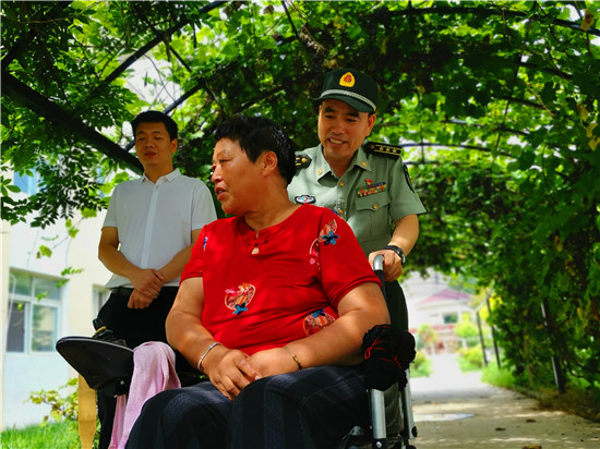 走進位于太昊路上的周口市老年護理院,院內(nèi)整潔有序、花蕊吐香鳥鳴聲聲,小徑通幽處的涼亭內(nèi)三五老人打牌、聊天,一副愜意安詳?shù)纳顖鼍?。在侯國領(lǐng)母親王玉勤居住的房間內(nèi),李揚、孫光濤等人坐在床邊與她聊天談心,看到這么多人來慰問她,王玉勤眼中流下了感動的眼淚,她對慰問人員表示感謝,說自己來護理院近一年來,吃住條件都不錯,護理院照顧的無微不至,身體一天天恢復(fù),閑暇時還能不依賴輪椅自己走上一段路。她激動地說:“感謝黨和政府的親切關(guān)懷,我最大的愿望是希望倆兒子永遠(yuǎn)聽黨的話,在部隊安心服役、再立新功,用優(yōu)異的成績回報黨和政府對我們?nèi)业年P(guān)愛?!?/p>
