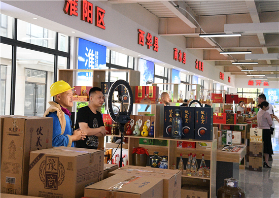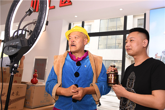 記者看到,川匯區(qū)直播電商產(chǎn)業(yè)基地直播大廳內,全市各個縣市區(qū)都在此設有土特產(chǎn)直播區(qū),川匯區(qū)賣的有伏羲貢酒等,淮陽區(qū)賣的泥泥狗、布老虎、黃花菜、健身器具等,西華縣賣的有胡辣湯料等各種土特產(chǎn)。商家們“八仙過海,各顯神通”紛紛請來各路網(wǎng)紅大咖們助力直播。川匯區(qū)四五酒業(yè)請來“光頭強”熱賣四五老酒,西華縣的商家請來“趙本山”帶貨直播叫賣。