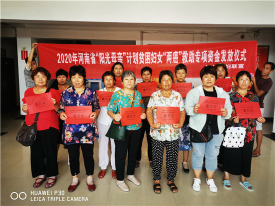 據(jù)悉,此次發(fā)放的公益金來自于河南省陽光母親貧困婦女兩癌救助金。其救助對象是經(jīng)過有檢查資質(zhì)的醫(yī)療機構(gòu)確診、患有宮頸癌ⅡB以上或浸潤型乳腺癌的農(nóng)村貧困婦女,救助標(biāo)準(zhǔn)為每人一次性救助1萬元。