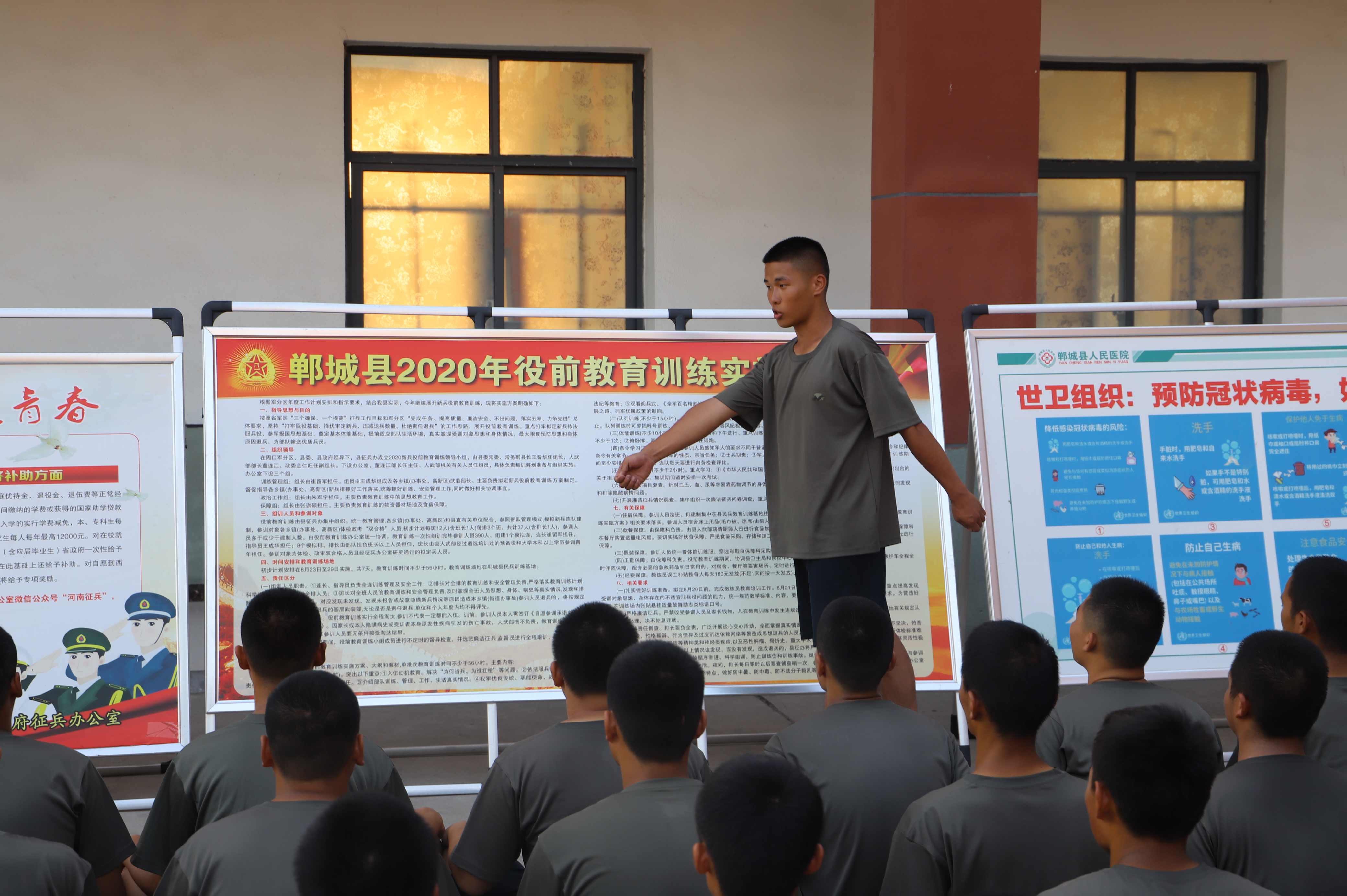 蛙跳、鴨子步、俯臥撐、側(cè)身敬禮、蹲起……盡管汗流浹背,兩位“老兵”在新兵面前沒(méi)有一絲疲倦,充分展現(xiàn)了軍人的風(fēng)采,也流露出了兩位青年向往軍營(yíng)的堅(jiān)定意志。
