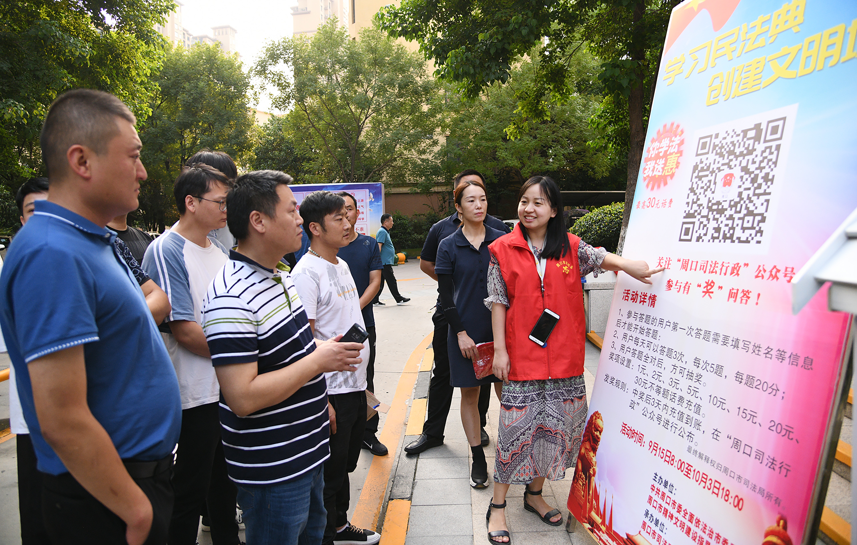 周口日報·新周口客戶端 我國于今年5月份頒布的《民法典》是一部被譽為“社會生活的百科全書”的法律,涉及民生諸多方面。近日,市司法部門深入社區(qū),以學(xué)法有獎形式,宣傳這部和老百姓生活密切相關(guān)的法律。圖為市司法部門工作人員在建業(yè)森林半島社區(qū)宣傳。記者 梁照曾 攝