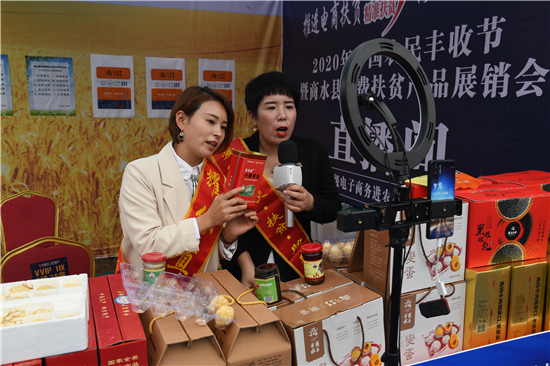 9月22日,兩名“網(wǎng)紅”在商水縣中國農(nóng)民豐收節(jié)暨商水縣消費(fèi)扶貧產(chǎn)品展銷會(huì)上進(jìn)行直播銷售。近年來,商水縣大力發(fā)展電商扶貧,出臺(tái)政策,幫助農(nóng)民通過網(wǎng)絡(luò)直播等手段把本地的豬蹄、咸鴨蛋、牛肉、變蛋、黑色五谷等特色農(nóng)產(chǎn)品銷往全國各地,打開農(nóng)產(chǎn)品銷售新渠道,為農(nóng)民脫貧致富奔小康增添新動(dòng)能。