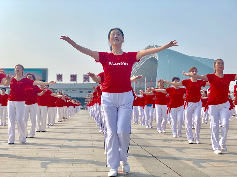 在活動(dòng)現(xiàn)場(chǎng),身穿紅色上衣,白色長(zhǎng)褲的廣場(chǎng)舞愛(ài)好者隨著音響里傳來(lái)的指令,面帶笑意舞動(dòng)著。