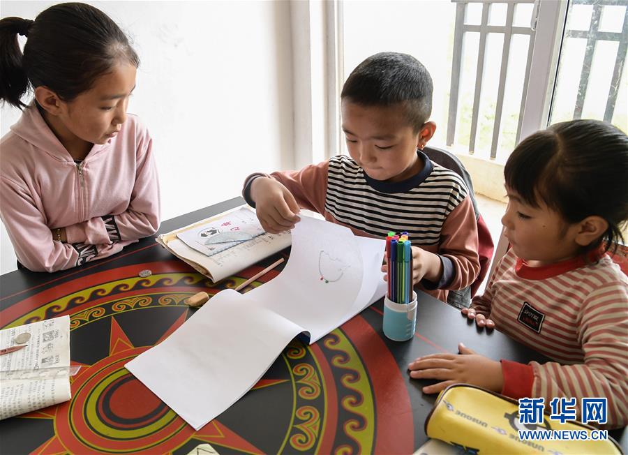 昭覺縣城城郊集中安置點南坪社區(qū)內(nèi),一戶彝族群眾家中的孩子圍坐在書桌旁畫畫(8月11日攝)。 新華社記者 李賀 攝