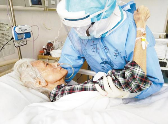 在武漢醫(yī)院,今年84歲的楊守振不僅感染新冠肺炎,而且有嚴(yán)重的營養(yǎng)不良,插著胃管,身體極為消瘦,生活不能自理。為了不讓老人出現(xiàn)壓瘡,胡奔奔需要每隔一個(gè)小時(shí)為老人翻一次身。翻身時(shí)候,為了讓老人更舒服一點(diǎn),她每次都像抱孩子一樣把老人抱在懷里,動(dòng)作輕柔地按摩老人受壓的部位,防止壓瘡的形成。