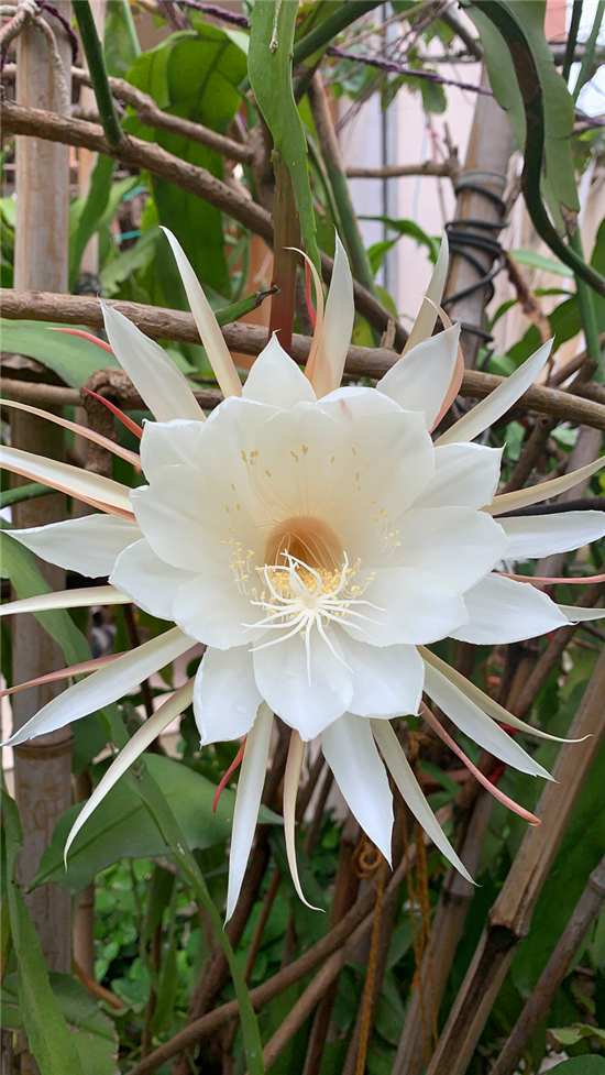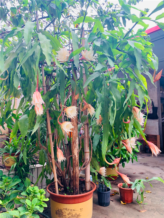 在周口市中心城區(qū)的一個家屬院里,記者見到了88歲的苗天才和他養(yǎng)的曇花,“一株21年樹齡的曇花開了43朵,另外兩株5年樹齡的曇花加起來開了13朵,這3株曇花一共開了56朵?!泵缣觳耪f,早上四五點的時候曇花就慢慢地開放了,到現(xiàn)在五六個小時過去了曇花還保持著開放狀態(tài)。