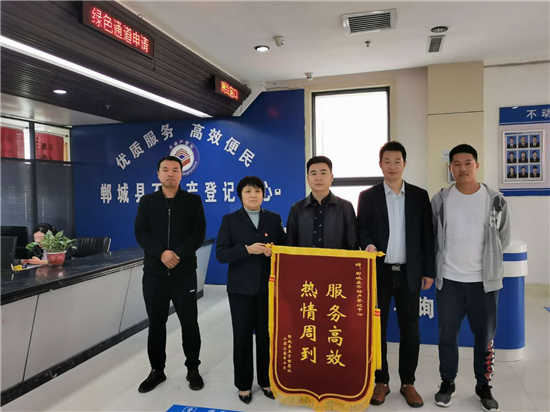 10月20日,鄲城縣王子世界城房地產(chǎn)開發(fā)企業(yè)代表將一面繡有“服務(wù)高效、熱情周到”的錦旗,送到鄲城不動(dòng)產(chǎn)登記中心窗口,對鄲城縣不動(dòng)產(chǎn)登記中心干部職工,主動(dòng)作為、心系企業(yè)、熱情服務(wù)的工作態(tài)度表示感謝。