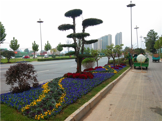 紅色、黃色、紫色的花兒,還有造型別致的景觀樹……10月21日,記者在周口中心城區(qū)七一東路上的一處綠化帶內看到了這樣一組造型別致的景觀造型,扮靚了綠化帶,給人耳目一新的感覺。記者 張洪濤 攝