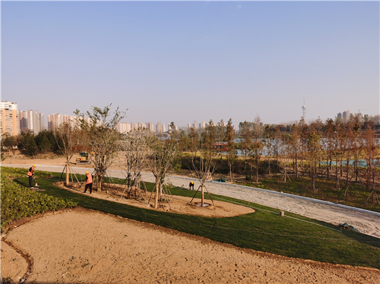11月11日,在中心城區(qū)沙潁河北岸周口大道至八一大道段生態(tài)改造工程EPC項目施工現(xiàn)場,施工人員正在進(jìn)行地被植物的種植、綠化樹木的養(yǎng)護(hù)。