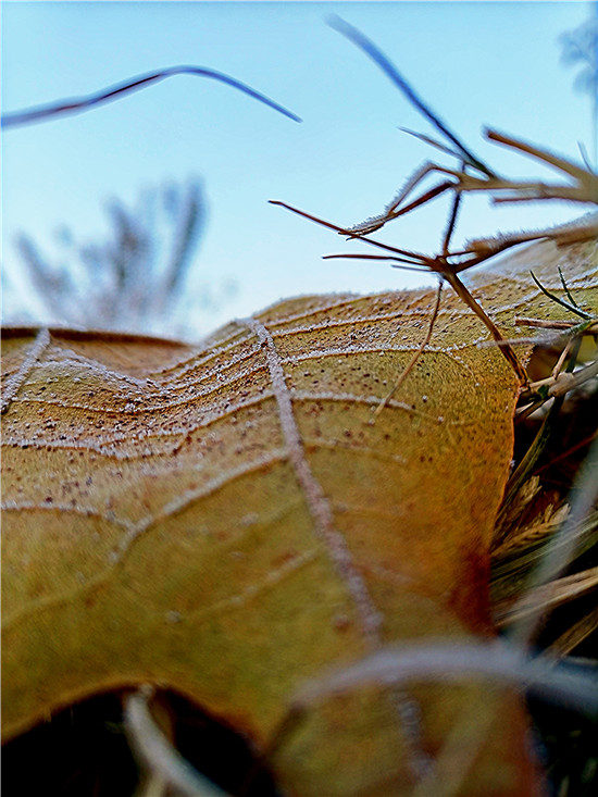 百草今何妝?茫茫著華霜。寒煙鎖素艷,疾步量路長。12月4日早晨,我市下霜了,潔白的華霜就像一層薄紗,在陽光的映照下分外美麗。