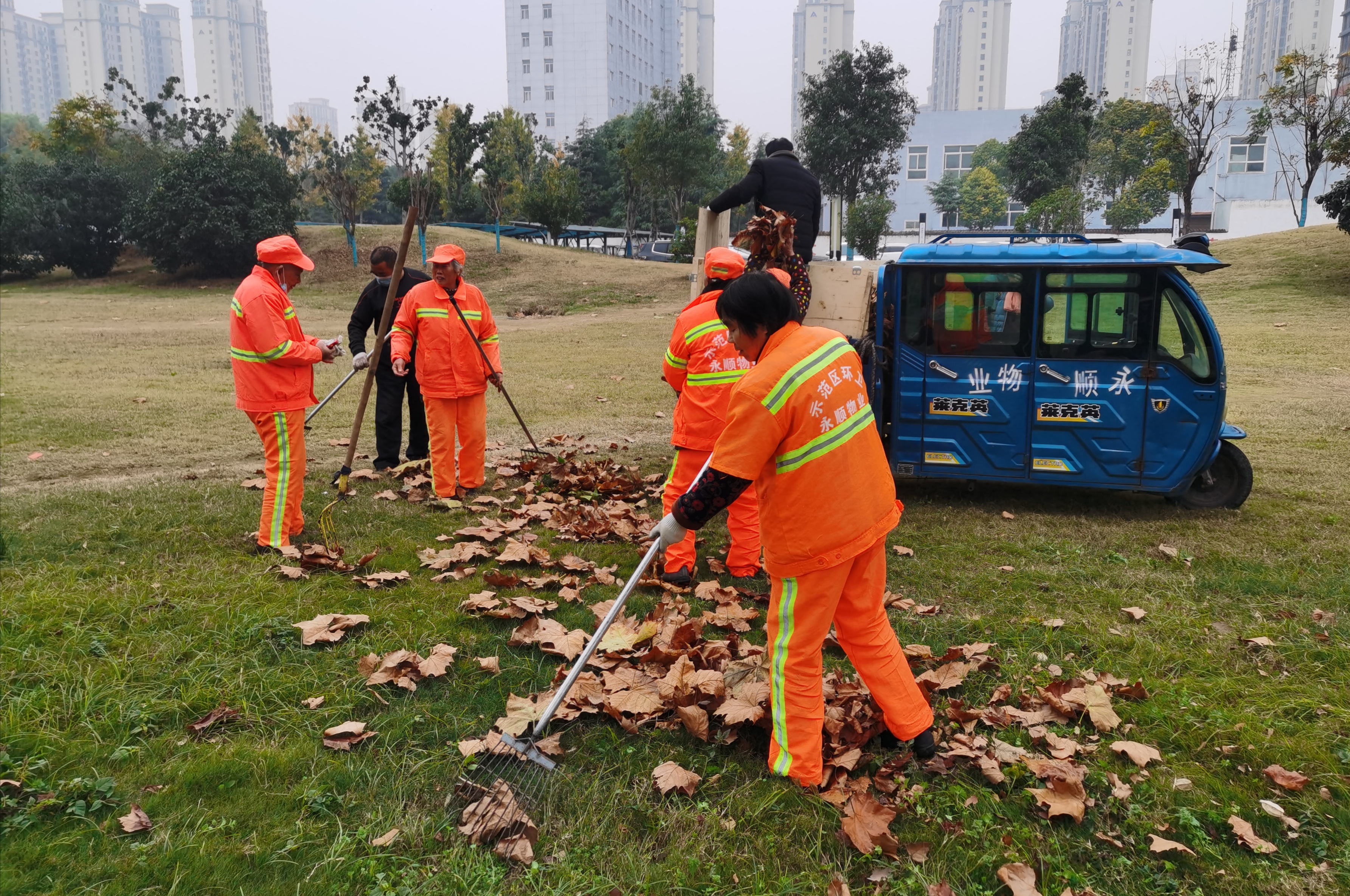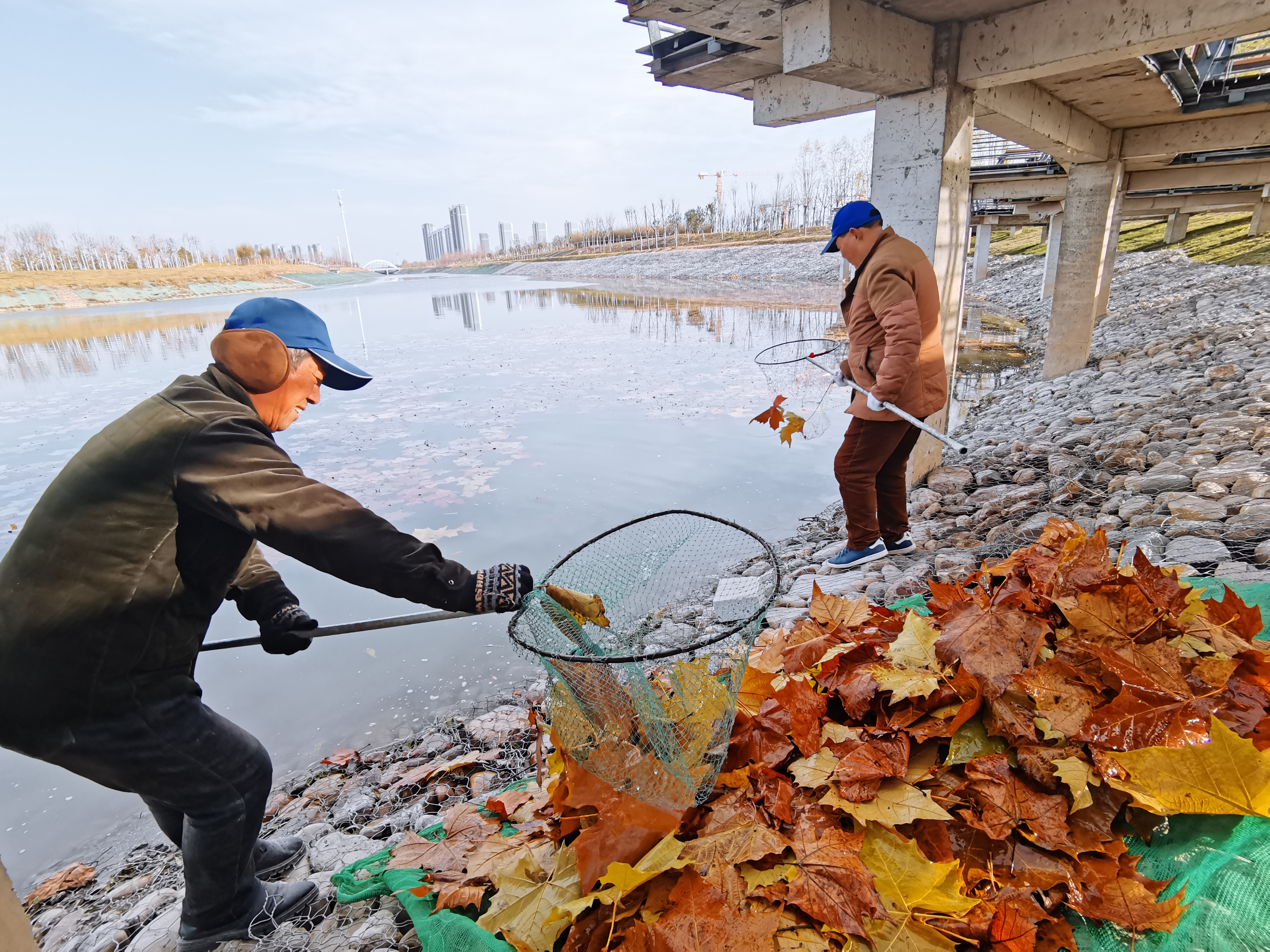 12月14日,環(huán)衛(wèi)工人在清理沙潁河水面上的枯樹葉等垃圾。最近,我市氣溫下降,枯樹葉紛紛落下,為了保持市區(qū)街道的干凈整潔,環(huán)衛(wèi)工人需要不斷地進行清掃,任務(wù)十分艱巨。為防止清掃好的樹葉被風(fēng)刮走,環(huán)衛(wèi)部門專門為環(huán)衛(wèi)工人配血封閉式三輪車、大號編織袋,盛放枯葉,最后樹葉由環(huán)衛(wèi)工人送往垃圾中轉(zhuǎn)站統(tǒng)一處理。