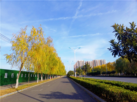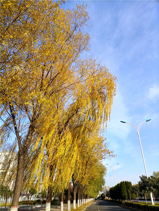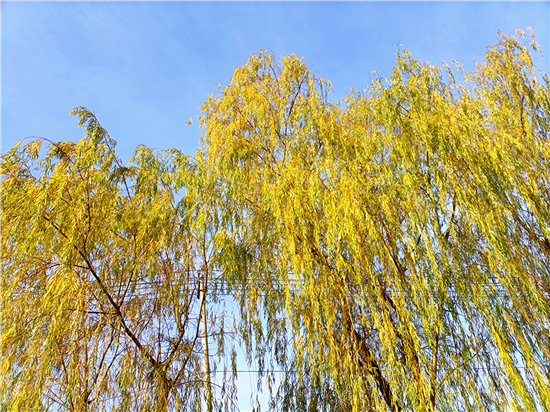 冬日暖陽照三川,垂柳更換鵝黃衫。無盡情思春可寄,千條萬條隨風(fēng)翩。12月15日,我市天氣晴朗,路旁一排排垂柳隨風(fēng)搖曳,像一個個舞動的小精靈,又像一團團鵝黃色的薄霧,如此美不勝收的風(fēng)景就像一幅畫,令人忍不住駐足欣賞。