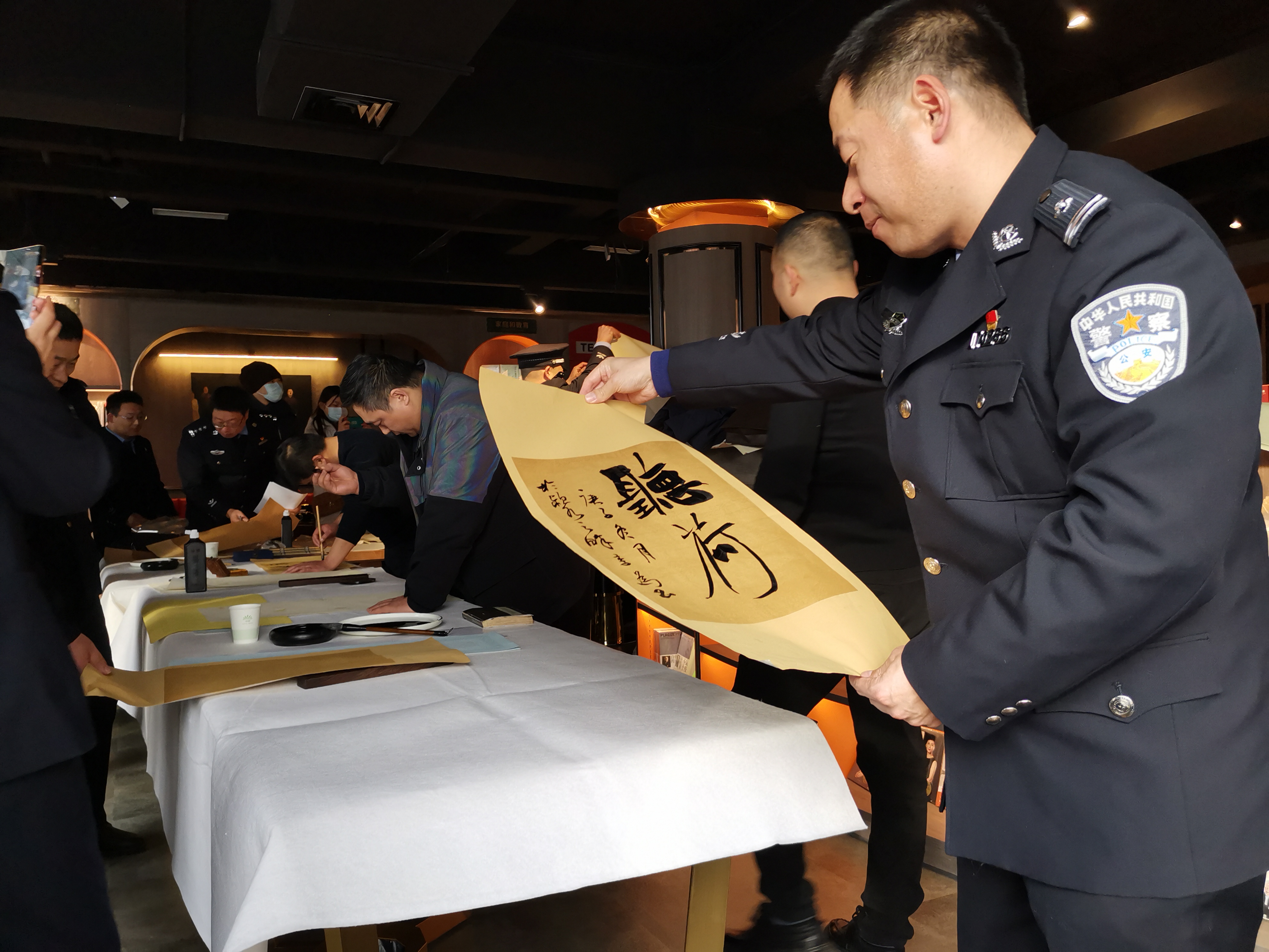 活動(dòng)現(xiàn)場(chǎng),氣氛熱烈,書(shū)法家們現(xiàn)場(chǎng)揮毫潑墨、筆走龍蛇,帶著喜迎牛年的美好祝愿。民警、輔警爭(zhēng)相圍觀,觀看、揣摩書(shū)法家們蒼勁有力的書(shū)法作品,房間內(nèi)洋溢著濃郁的節(jié)日氣息。