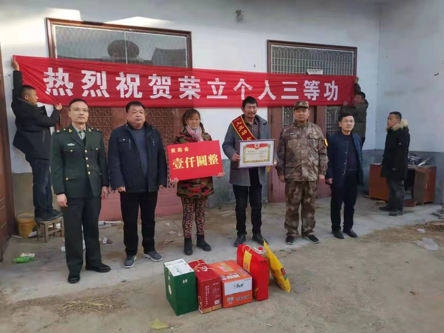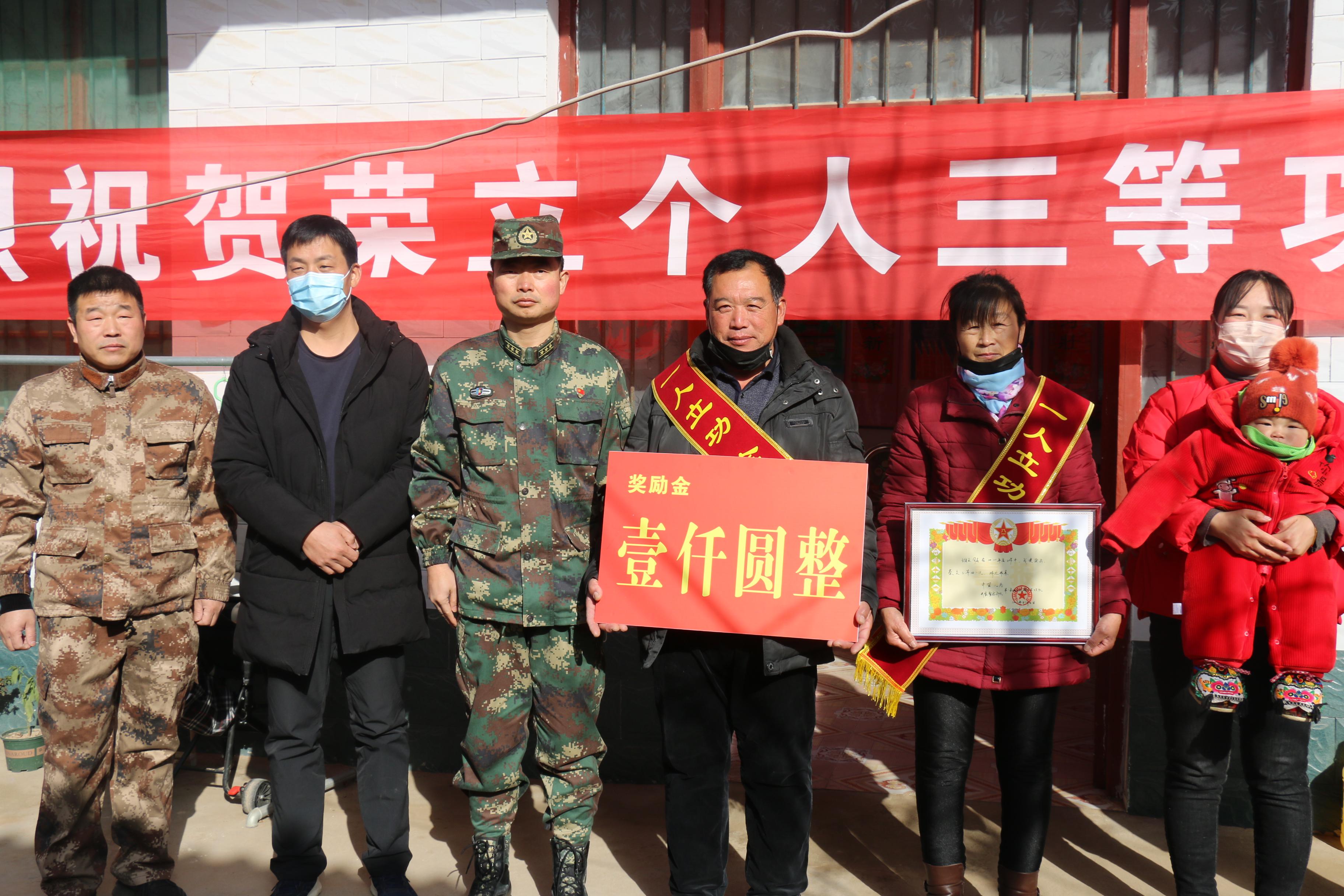 1月12日上午,西華縣西華營(yíng)鎮(zhèn)雙樓村某部士官高志豪家中鑼鼓喧天,喜氣洋洋。該縣人武部政委涂友佳、縣退役軍人事務(wù)局局長(zhǎng)龔坤敬一起把二等功喜報(bào)和“一人立功,全家光榮”的紅色綬帶及5000元現(xiàn)金等送到高志豪及其父母手中。