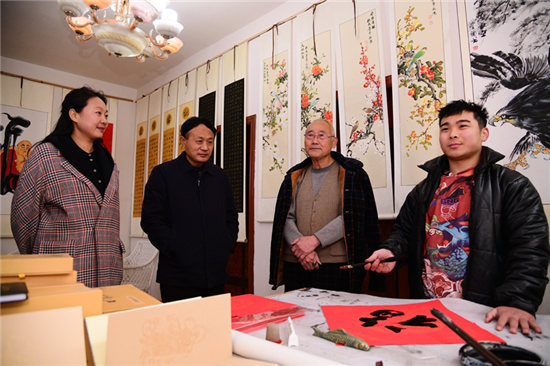 在建豪工作室的斜對(duì)面,是50歲村黨支部書(shū)記、村文聯(lián)主席盧全禮的書(shū)畫(huà)工作室。盧全禮書(shū)畫(huà)兼擅,還會(huì)武術(shù)、木刻、舞獅子,是附近有名的才子。記者看到,他為太康縣第二屆農(nóng)民豐收節(jié)創(chuàng)作的中國(guó)畫(huà)《黃土地的心聲》,以該村嗩吶吹奏藝人幸福而夸張的演出情景,歌頌農(nóng)村脫貧攻堅(jiān)取得的巨大成果,極具鄉(xiāng)土氣息。在他的畫(huà)室,滿身文藝范兒的五西村民,正以新時(shí)代松鶴延年吉祥農(nóng)民畫(huà),齊心打造中原畫(huà)鶴第一村。經(jīng)過(guò)培訓(xùn)的農(nóng)村大嫂大媽執(zhí)筆齊描畫(huà),一時(shí)鶴鳴九皋,翩翩欲飛。