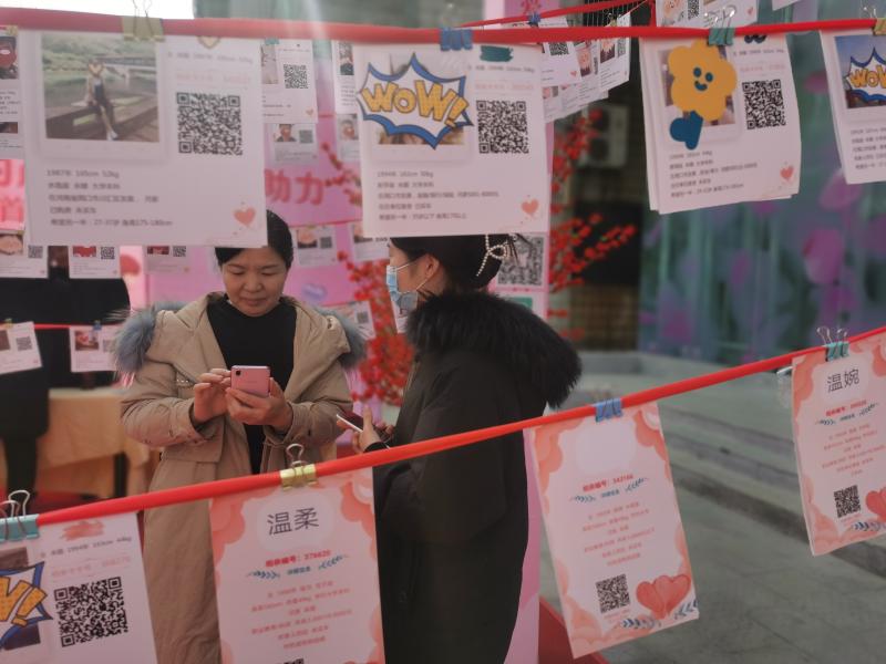2月6日,不少市民在位于五一路與七一路交叉口的愛的茂商場門口的相親角駐足觀看,了解情況。
