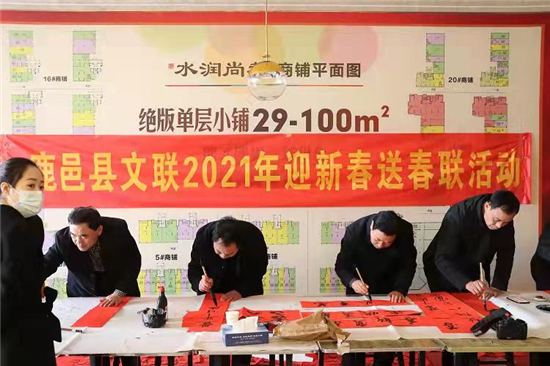 “我是做生意的,能幫我寫一幅跟生意有關(guān)的春聯(lián)嗎?”2月7日,寒風(fēng)凜冽,鹿邑縣水潤尚都、水潤上苑兩個(gè)樓盤售樓處大廳卻春意融融。鹿邑縣文聯(lián)、縣書法家協(xié)會(huì)十余人走進(jìn)社區(qū)揮毫潑墨為業(yè)主送上濃濃的新春祝福。