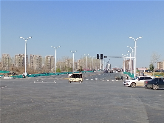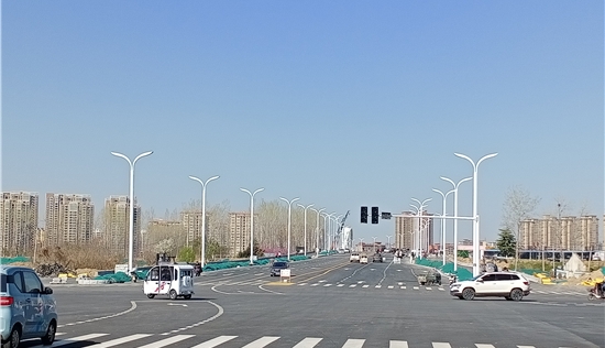 圖片說(shuō)明:3月22日下午,記者在周口市中心城區(qū)中原路跨沙潁河大橋南側(cè)看到,一個(gè)個(gè)嶄新的路燈桿出現(xiàn)在道路兩側(cè)。藍(lán)天白云下,這些路燈桿顯得格外醒目,既扮靚了大橋,又方便了市民出行。