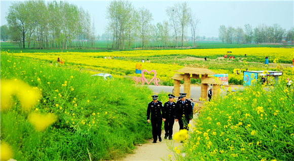 4月10日上午,商水縣公安局組織民警在鄧城鎮(zhèn)6000多畝油菜花海中執(zhí)勤巡邏,疏導(dǎo)交通,確保游客安全。當(dāng)日,商水縣首屆金色花田樂(lè)游匯暨農(nóng)特產(chǎn)品展銷會(huì)開(kāi)幕式在此舉行。來(lái)自市內(nèi)外的數(shù)萬(wàn)名游客到這里踏青賞春。