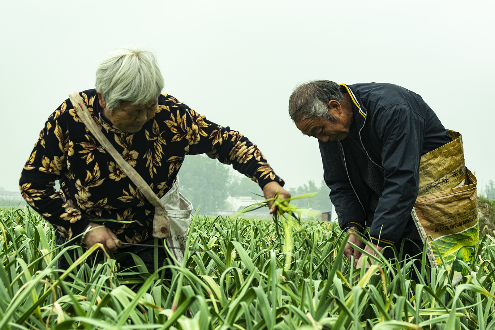 姚路口村一對老夫婦在自己蒜地里提取晚蒜薹