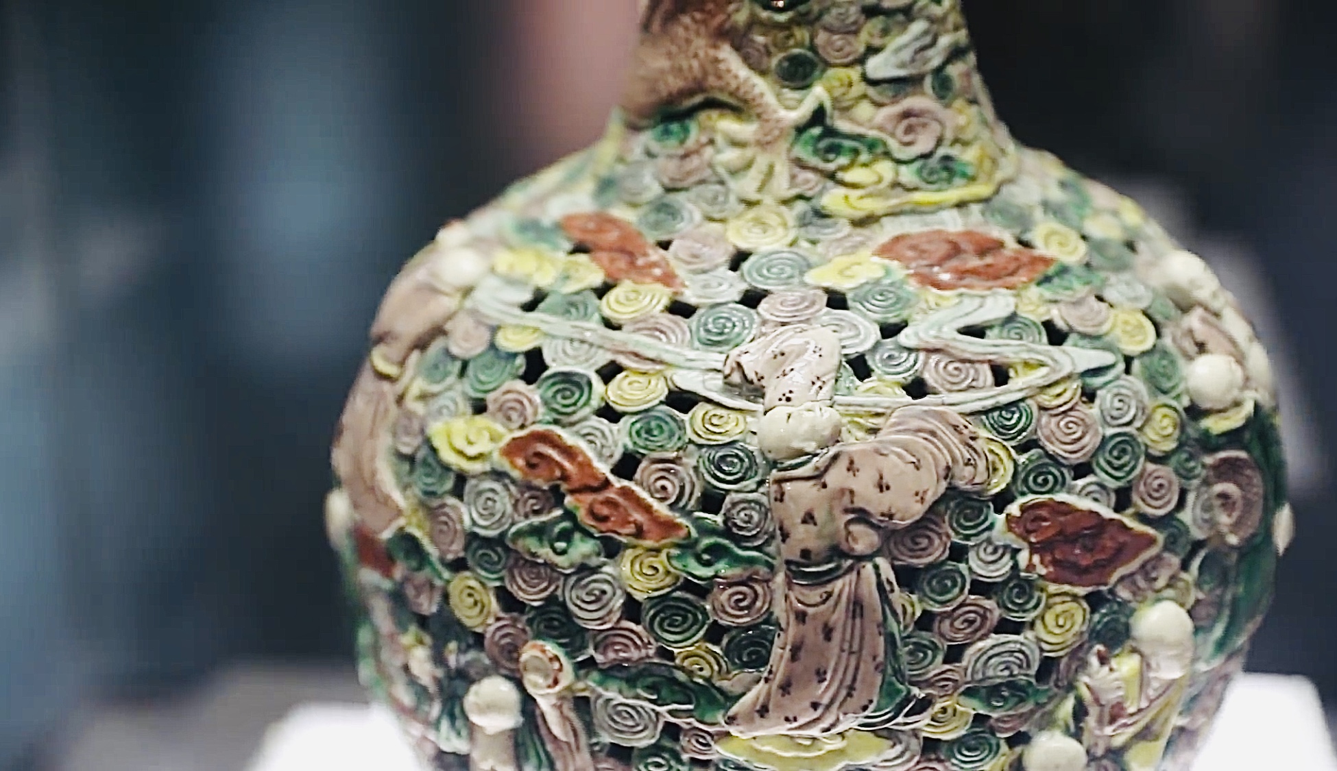 我是五彩透雕十八羅漢云龍瓶,又名古瓷流韻天球瓶。靜謐的空間里,我站在周口市博物館的玻璃展柜里,瞅瞅四周的兄弟姐妹,我偷偷笑了。雖沒有長睫毛和雙眼皮,但我可是個(gè)十足的“混血兒”。技藝精湛、圖案華貴、色彩艷麗,我的稀有性和珍貴性常常讓來訪者驚嘆不已。和青花瓷相比,我更加瑰麗多彩,人稱文物界的“米蘭·可兒”。