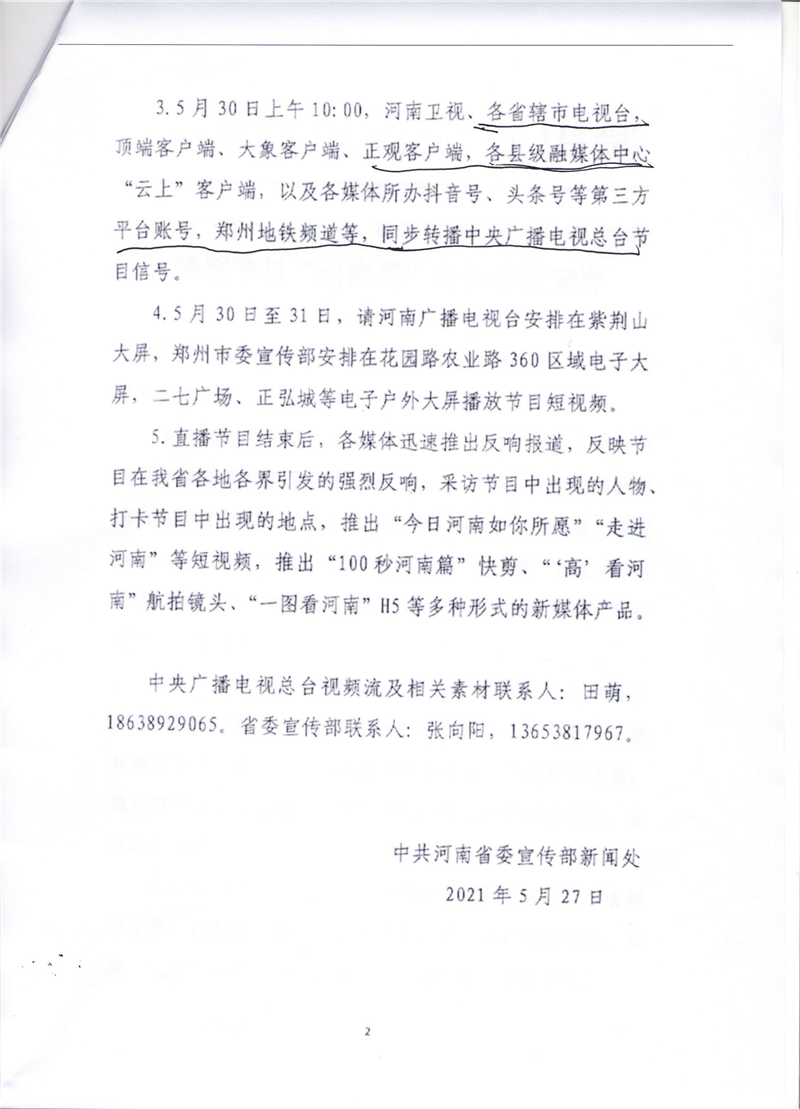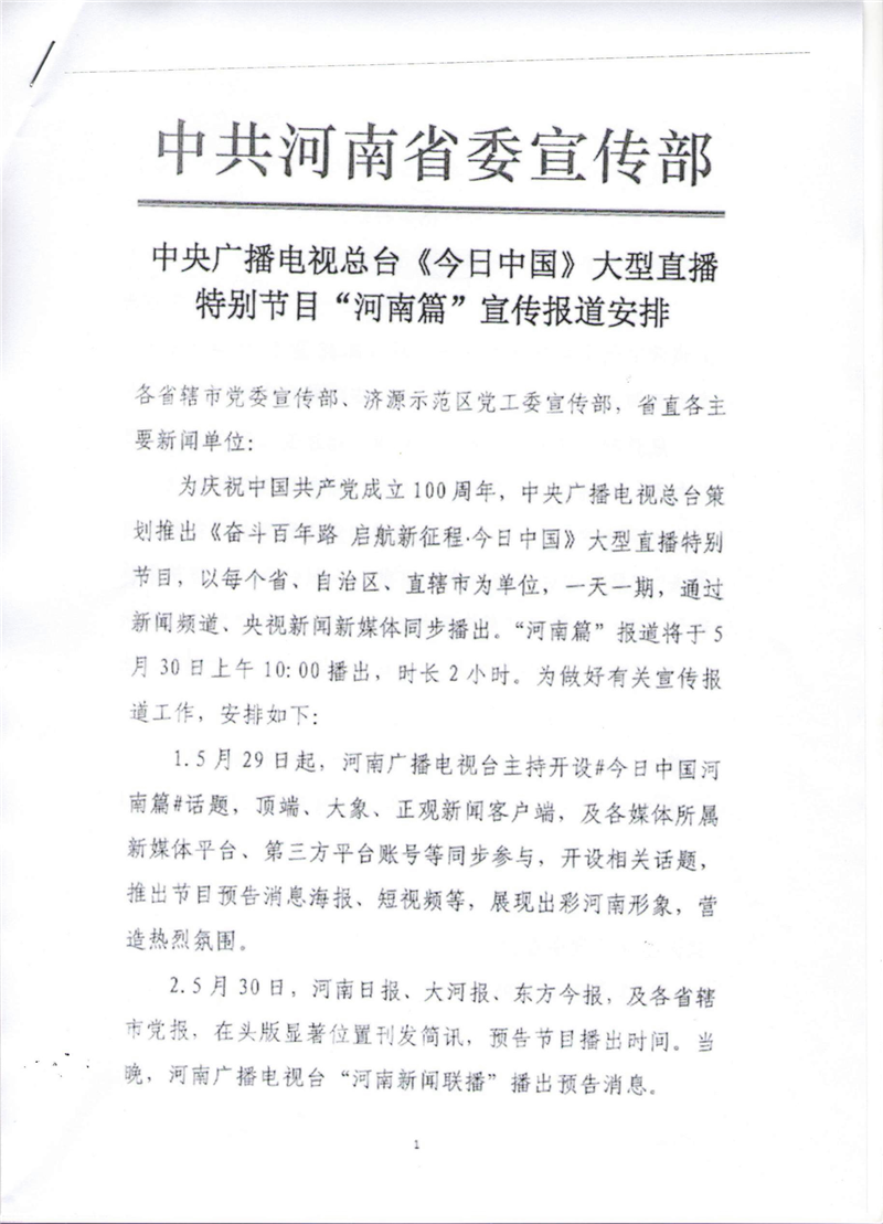 中央廣播電視總臺(tái)《今日中國》大型直播特別節(jié)目“河南篇”宣傳報(bào)道安排