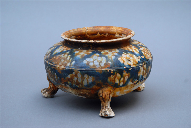 1998年10月,沉睡許久的唐藍(lán)釉三彩爐迎來(lái)了它的今世。周口市農(nóng)村信用社在建工地上,發(fā)現(xiàn)了一座唐代墓葬。在其中沉睡的唐藍(lán)釉三彩爐被吵醒,來(lái)到了它的新家——周口市博物館。它敞口,圓唇,短立徑,弧肩,鼓腹,下有三獸蹄足支撐它站立,樣貌圓潤(rùn)飽滿(mǎn),與唐代藝術(shù)豐滿(mǎn)、健美、闊碩的特征是一致的。唐藍(lán)釉三彩爐不僅體現(xiàn)了唐代人的制陶工藝和智慧,更是絲綢之路與中西文化和物資交流融合的見(jiàn)證,渾身散發(fā)歷史與藝術(shù)的魅力。