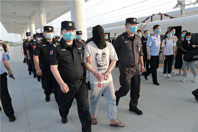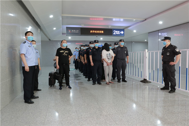 當(dāng)天,西華縣公安局在鄭阜高鐵西華站舉行歡迎儀式,迎接赴西安抓捕組凱旋歸來。特警在站臺(tái)上排列整齊、嚴(yán)陣以待,列車準(zhǔn)時(shí)??康秸荆?名犯罪嫌疑人隨即被押解下車,全副武裝的特警立即上前進(jìn)行押解交接,押往在高鐵出站口等候的裝甲車上。至此,歷經(jīng)三天三夜,一起電信網(wǎng)絡(luò)詐騙團(tuán)伙案成功告破。