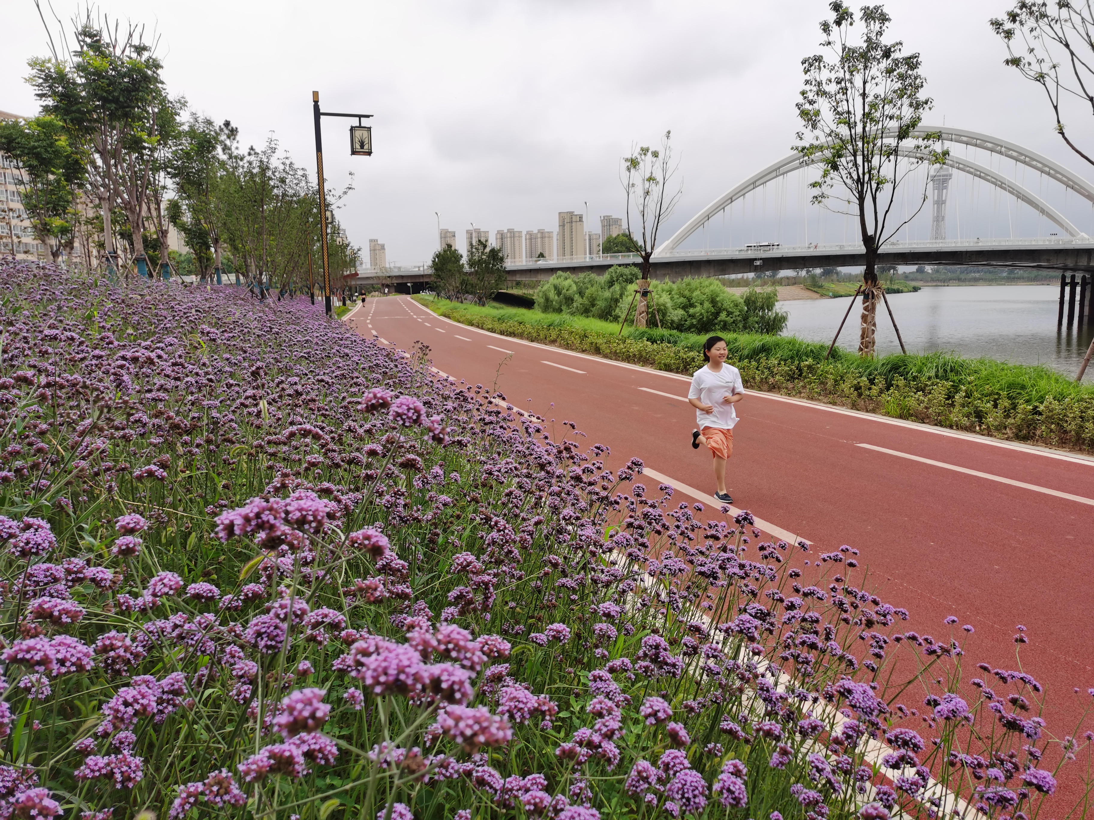 7月6日早晨,市民在馬鞭草花開正盛的沙潁河北岸晨跑。