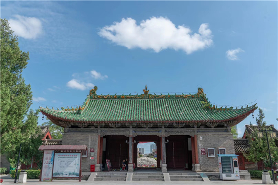 整個(gè)古建筑群為仿宮殿式,山門、鐵旗桿、石牌坊、碑亭、饗殿、大殿、河伯殿、炎帝殿、戲樓、拜殿、春秋閣由南向北,建于中軸線上,藥王殿、灶君殿和東廊房,財(cái)神殿、酒仙殿及西廊房在前院左右,東西看樓、東西配殿建在中院兩側(cè),老君殿、馬王殿、瘟神殿為東偏房,客房僧舍位于西院。是全國重點(diǎn)文物保護(hù)單位,國家AAAA級旅游景區(qū),國家三級博物館。