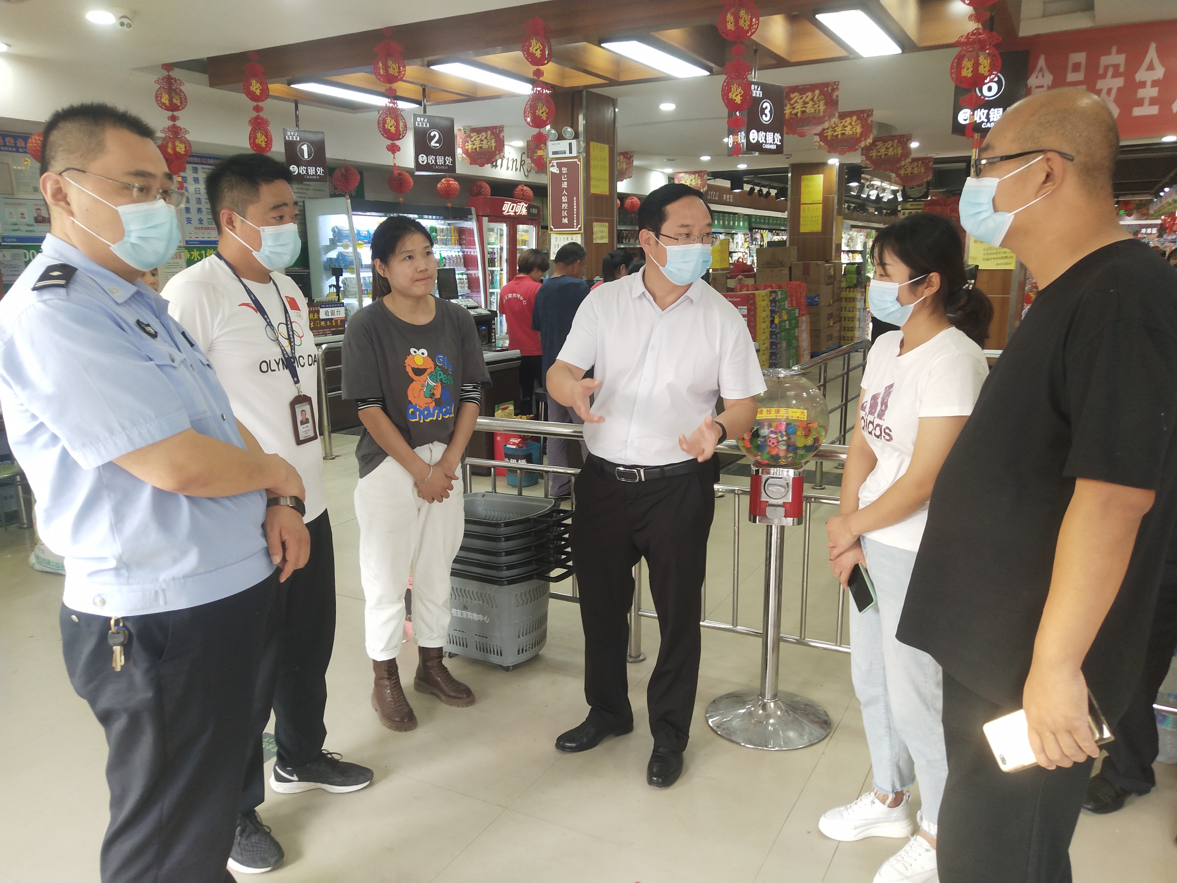 “你們這個超市經營面積多少?配備多少消防栓、滅火器?有幾個逃生通道?員工是否熟知消防安全常識?油炸熟食肉類食品是如何保障質量的……”“咱樓上樓下營業(yè)面積共2000平方米,配備20個消防栓、60個滅火器,有2個逃生通道,每周都對員工進行消防安全演練,每一批食品都有檢測報告……”10月1日下午,商水縣平店鄉(xiāng)黨委書記段文海、鄉(xiāng)長位望喜、主管安全生產的副鄉(xiāng)長劉春苗帶隊,組織鄉(xiāng)派出所、市場監(jiān)督所相關人員到安全生產重點場所“萬果園超市90號”連鎖店開展國慶節(jié)安全生產暗訪檢查,超市負責人呂四偉詳細介紹了安全經營情況。
