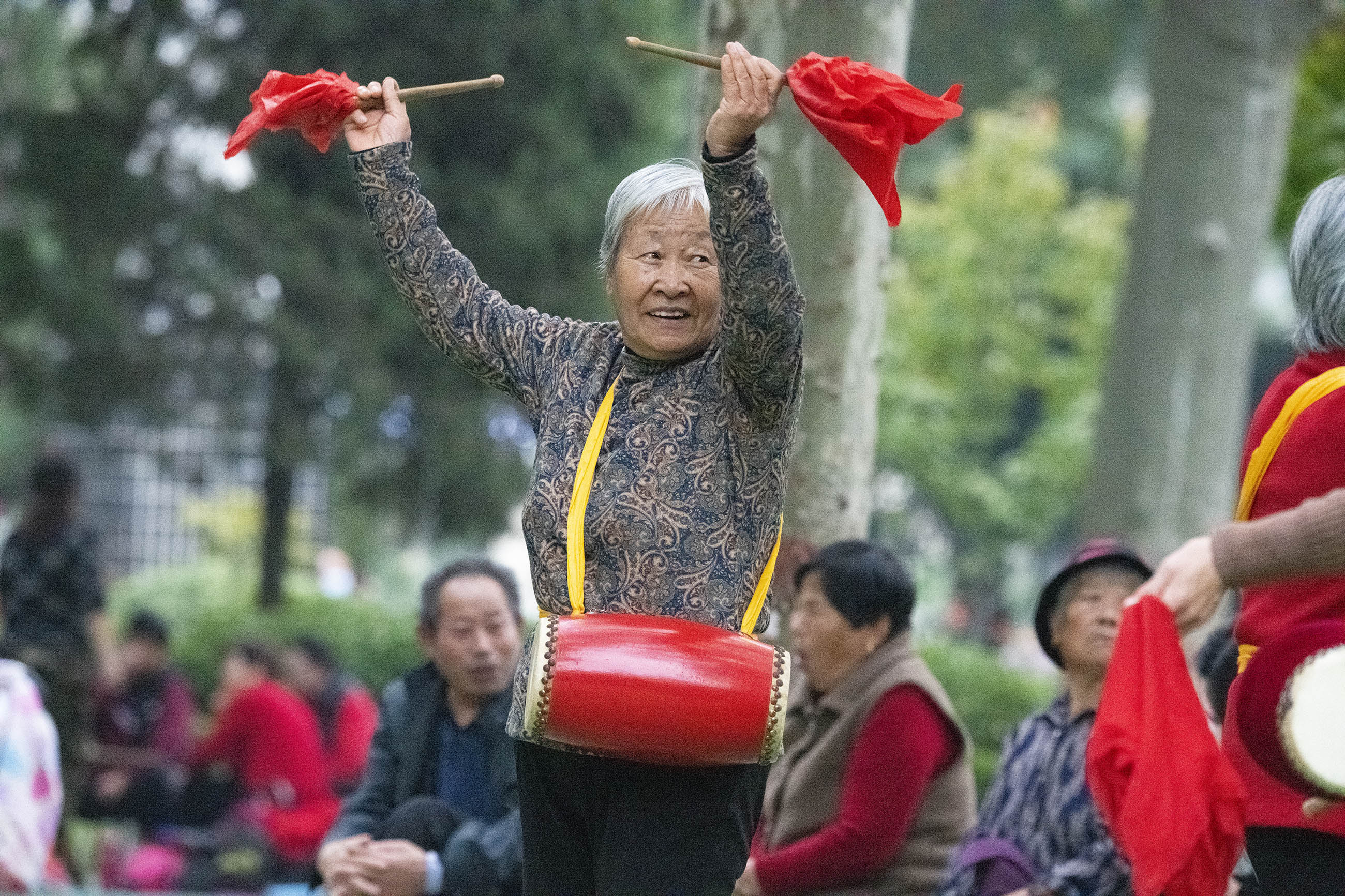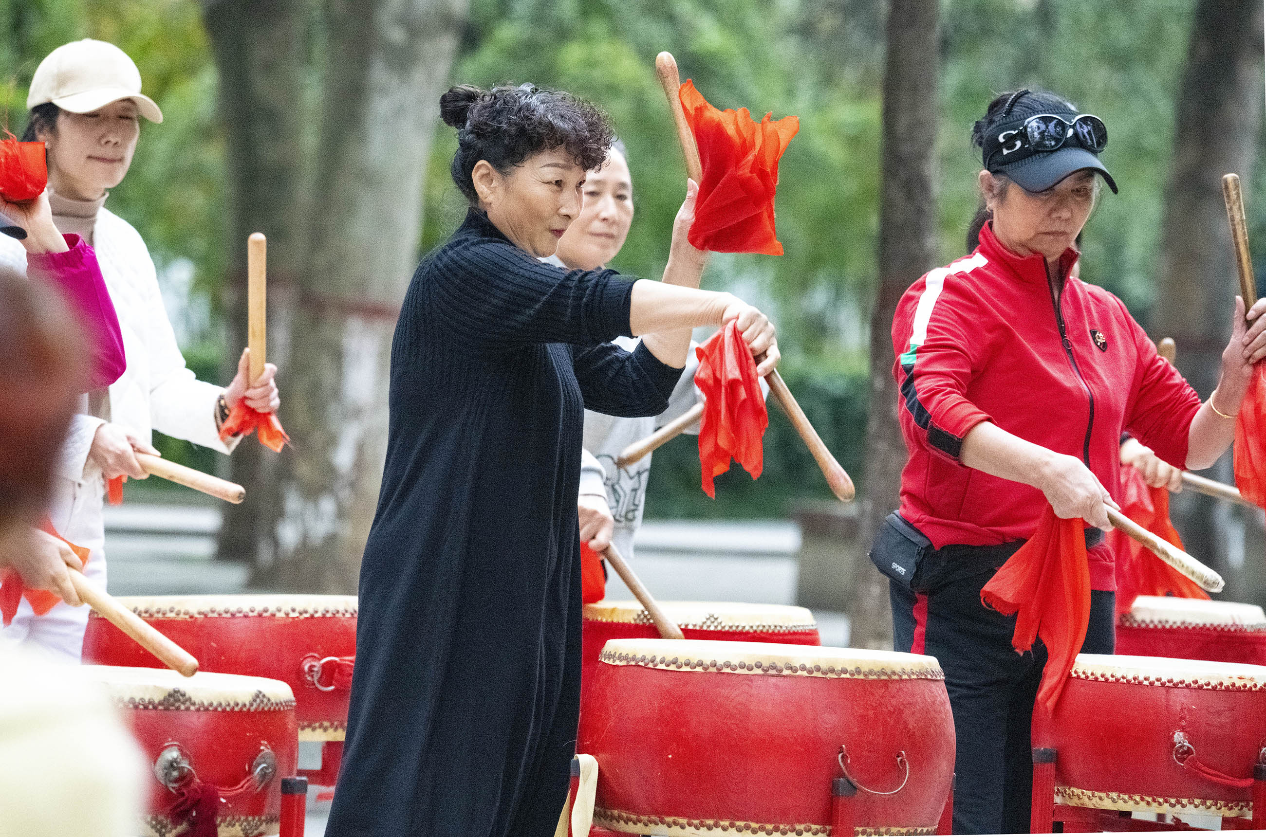 10月26日下午,在周口人民公園,老人們打腰鼓、敲盤鼓、扭秧歌,盡享晚年快樂(lè)生活。