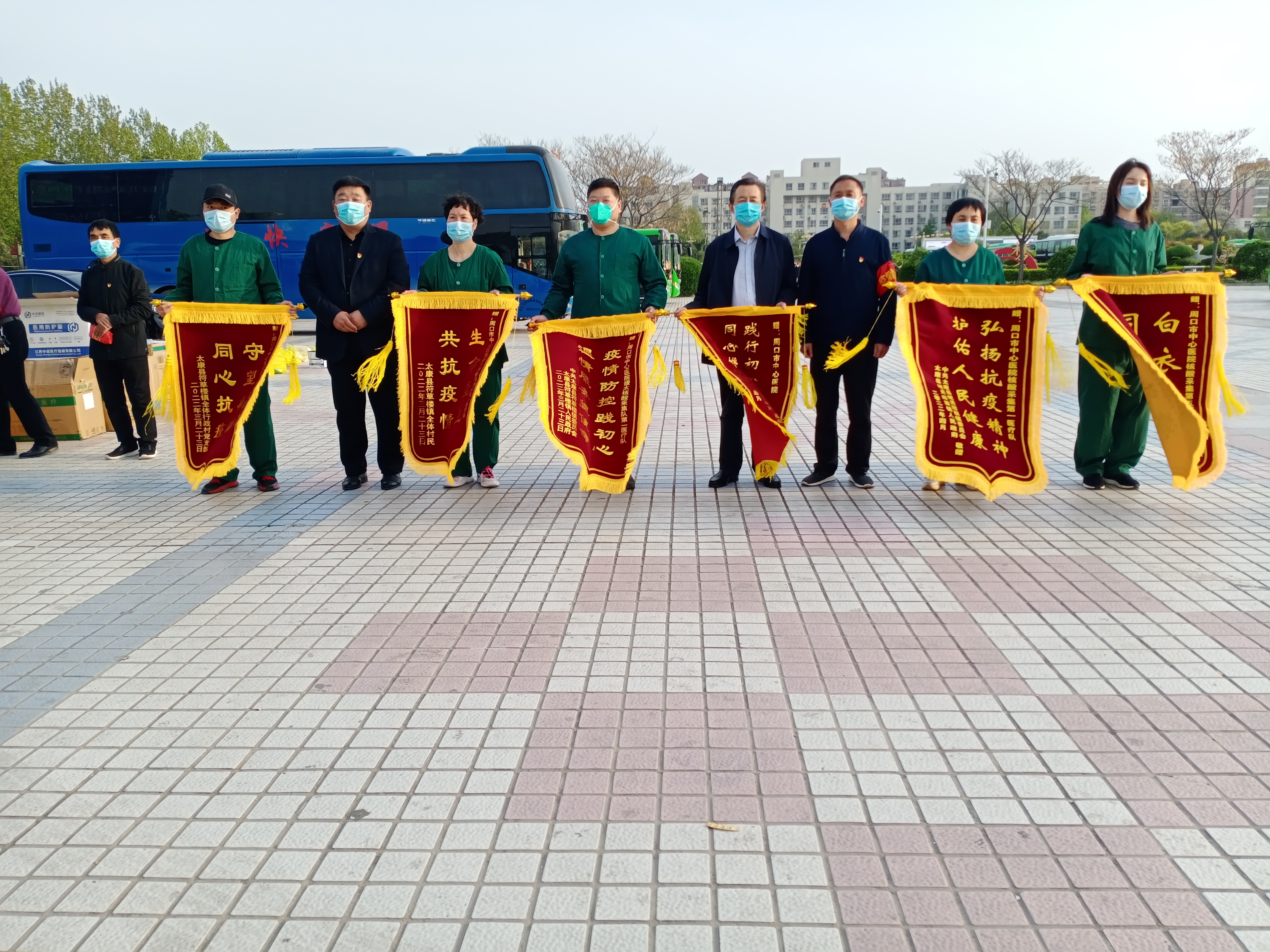 日前,太康縣城關(guān)鎮(zhèn)、符草樓鎮(zhèn)相關(guān)負(fù)責(zé)人將寫有“白衣執(zhí)甲 同心抗疫”“弘揚(yáng)抗疫精神 護(hù)佑人民健康”“守望相助 同心抗疫”字樣的錦旗送到前來支援太康縣的周口市中心醫(yī)院醫(yī)務(wù)人員手中,感謝他們的無(wú)私幫助。③6 記者 張洪濤 攝