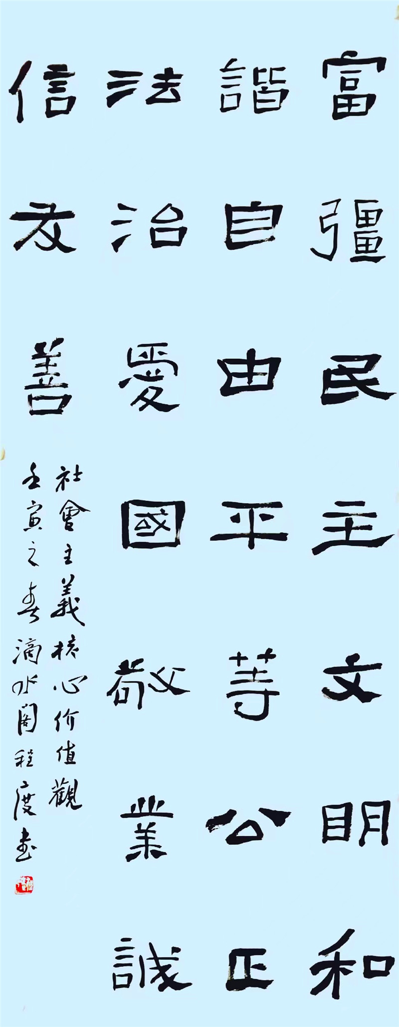 程度 中國(guó)書(shū)法家協(xié)會(huì)理事、隸書(shū)委員會(huì)委員,北京書(shū)法家協(xié)會(huì)理事,北京市朝陽(yáng)區(qū)書(shū)法家協(xié)會(huì)秘書(shū)長(zhǎng)(社會(huì)主義核心價(jià)值觀)