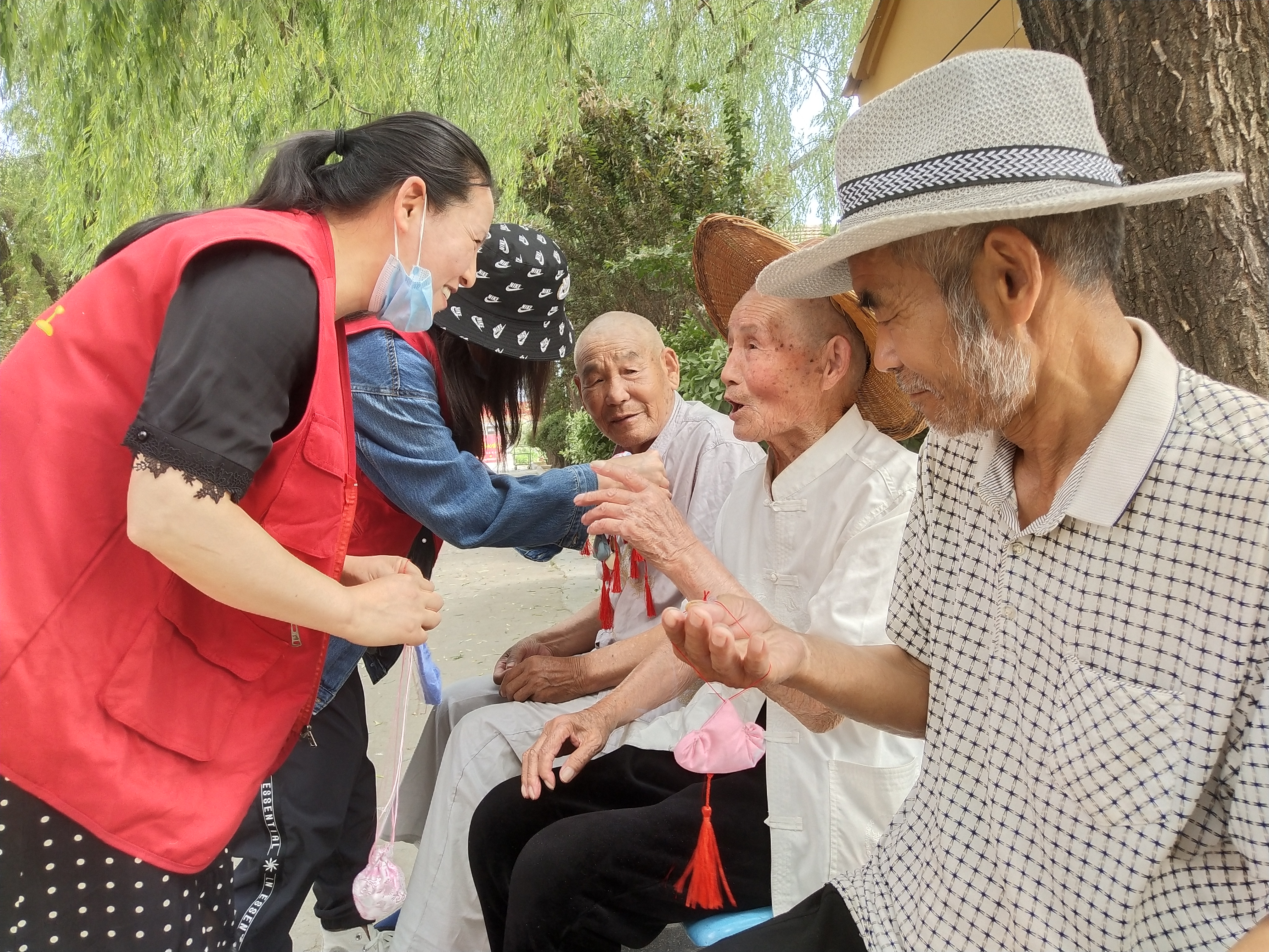 “大爺,大娘,來(lái)吃水果,我把香包給您戴上,祝您端午安康,健康長(zhǎng)壽......”劉玉英委托的愛(ài)心志愿者戚素華、劉影、袁鳳蓮、李霞、姚君英、李艷紅、王香清等還給敬老院的老人送來(lái)了粽子、水果,和老人聊天交談、佩戴香包,老人們臉上綻開(kāi)了幸福的笑容。