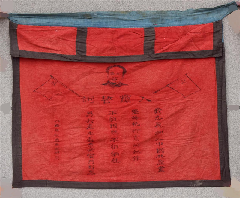 在德高民俗博物館,陳列著這樣一面旗幟,旗身長約90厘米,寬約70厘米,旗幟上印有毛澤東同志頭像及入黨誓詞文字,旗幟左下方印有“八路軍抗戰(zhàn)指揮部制”落款文字,該入黨誓詞旗幟為抗日戰(zhàn)爭時期制作完成。凝視這面旗幟,對革命先烈的欽佩感油然而生。