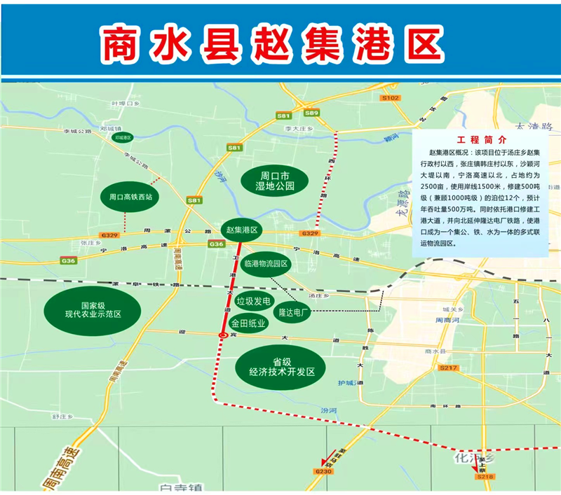 2017年,商水縣政府按照前瞻30年、謀劃15年、做實(shí)近5年工作要求,開始規(guī)劃修建位于湯莊鄉(xiāng)趙集行政村以西,張莊鎮(zhèn)韓莊村以東,沙潁河大堤以南,寧洛高速以北的趙集作業(yè)區(qū)。規(guī)劃建設(shè)占地約720畝、總投資6.37億元的趙集港項(xiàng)目,同時(shí)修建12個(gè)1000噸級(jí)泊位,其中散貨泊位8個(gè),通用泊位2個(gè),多用途泊位2個(gè),占用岸線1250米,預(yù)計(jì)年吞吐量達(dá)475萬噸。碼頭采用順岸式布置,結(jié)構(gòu)采用重力式扶壁結(jié)構(gòu),前沿配置30噸門座式固定吊裝卸作業(yè)。港口涵蓋貨物拆解區(qū)、散件堆放區(qū)等4個(gè)功能區(qū),集裝箱露天堆場(chǎng)、大型貨車停車場(chǎng)等5個(gè)場(chǎng)地。圍繞趙集港,高標(biāo)準(zhǔn)規(guī)劃建設(shè)占地約6.2平方公里的多式聯(lián)運(yùn)臨港經(jīng)濟(jì)園區(qū),下設(shè)金田紙業(yè)、建材倉(cāng)儲(chǔ)兩個(gè)物流園區(qū),涵蓋建材及建材制品園區(qū)、造紙業(yè)原料及成品園區(qū)、紡織服裝原料及成品園區(qū)3個(gè)功能園區(qū)。該項(xiàng)目建成投入使用后,不但能加快商水縣紡織園區(qū)、循環(huán)園區(qū)、經(jīng)濟(jì)開發(fā)區(qū)、隆達(dá)電廠等企業(yè)物質(zhì)的流轉(zhuǎn),而且能使商水港成為周口沙潁河重要的鐵運(yùn)、陸運(yùn)、水運(yùn)交通樞紐、貨物貿(mào)易和物流中轉(zhuǎn)聚集區(qū),從而進(jìn)一步促進(jìn)商水經(jīng)濟(jì)的健康、快速發(fā)展。
