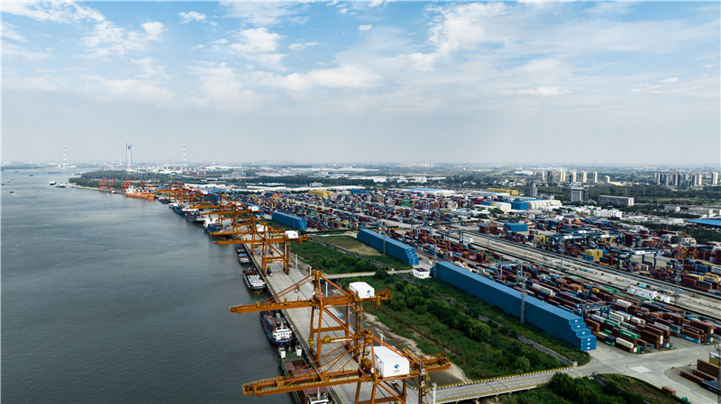 碧藍晴空,江風悠悠。長江江面上,一艘艘集裝箱班輪陸續(xù)抵達龍?zhí)陡蹍^(qū),碼頭邊的岸橋一直在忙碌著將集裝箱吊裝上岸,五顏六色的集裝箱被如同搭積木一樣整齊堆放。