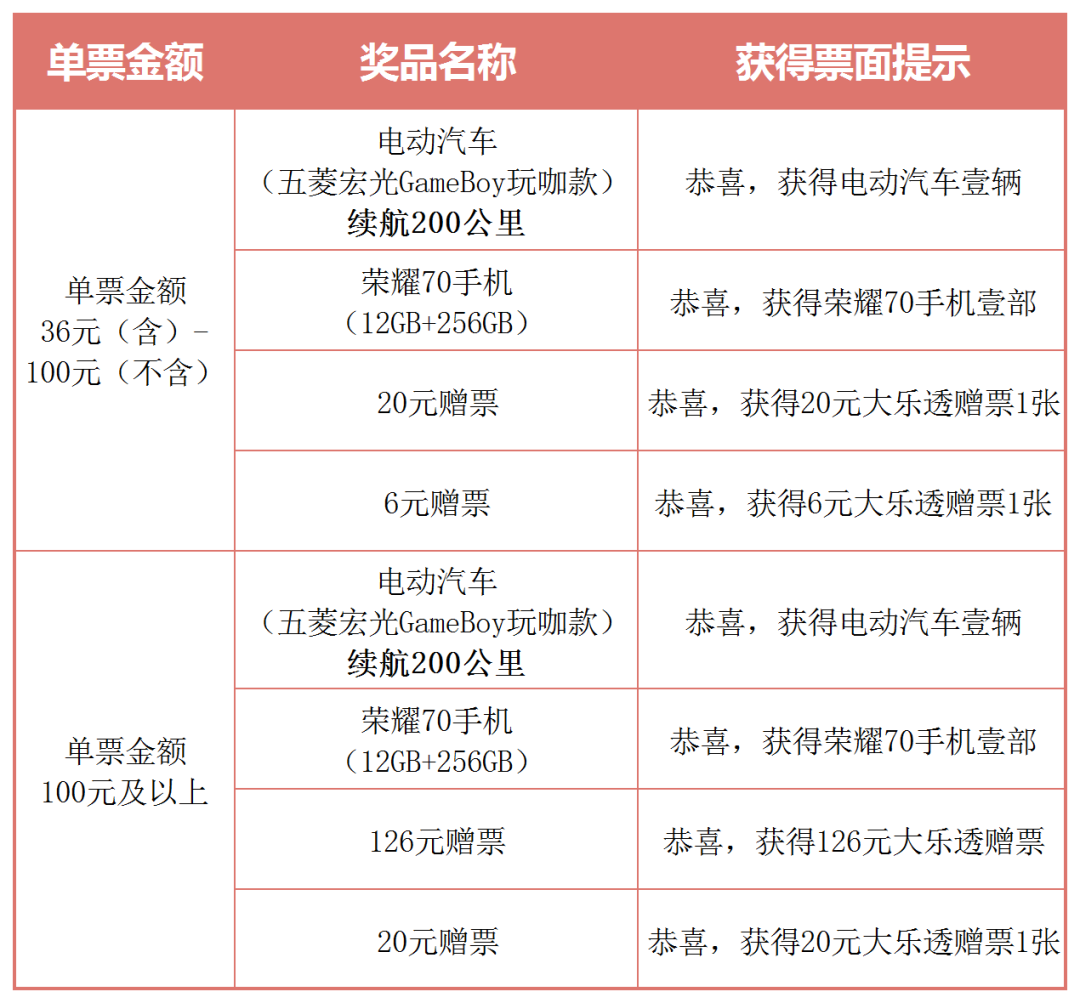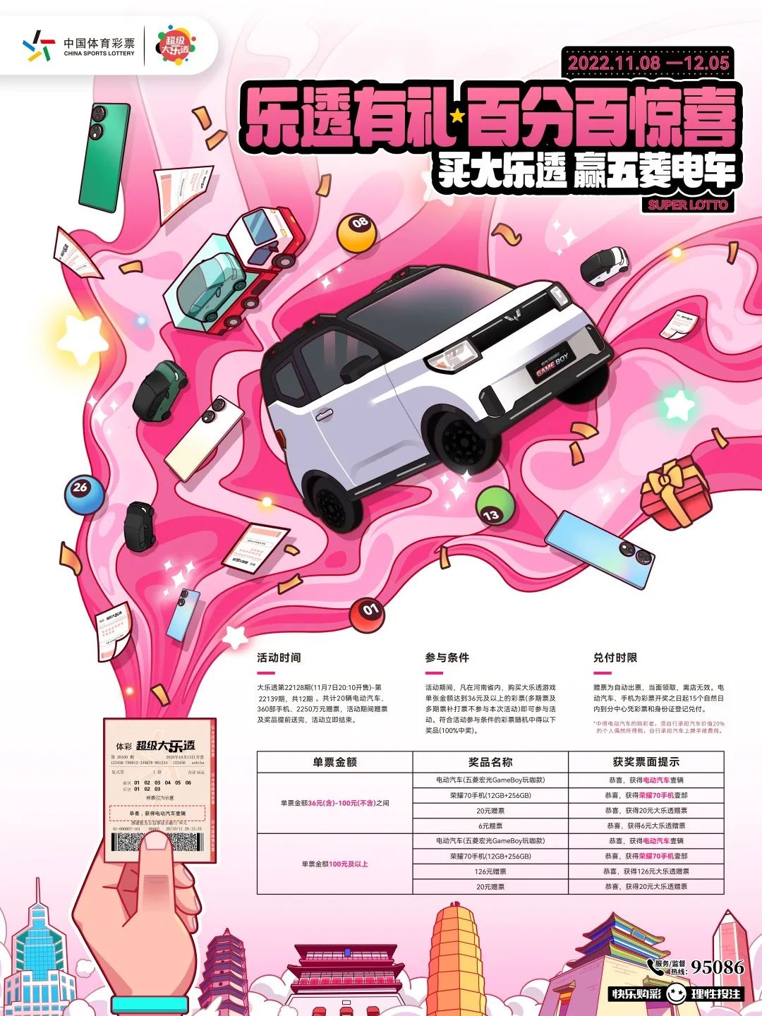 活動期間,凡在河南省內(nèi),購買大樂透游戲單張金額達(dá)到36元及以上的彩票(多期票及多期票補打票不參與本次活動,以下同)即可參與活動。有機會中得電動汽車、榮耀70手機、126元贈票、20元贈票、6元贈票等。