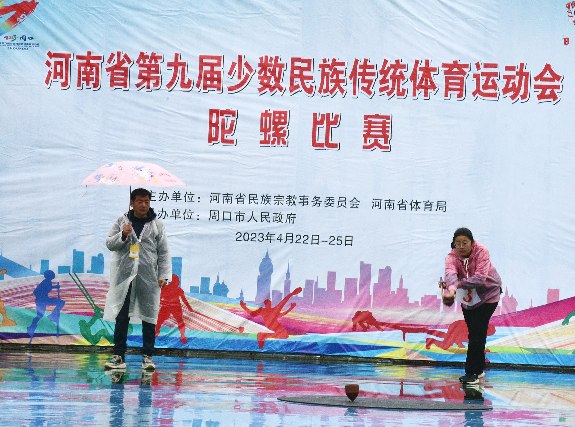 4月23日上午,河南省第九屆少數(shù)民族傳統(tǒng)體育運(yùn)動(dòng)會(huì)開賽。圖為在市體育中心進(jìn)行的板鞋競(jìng)速和陀螺比賽。記者 梁照曾 攝