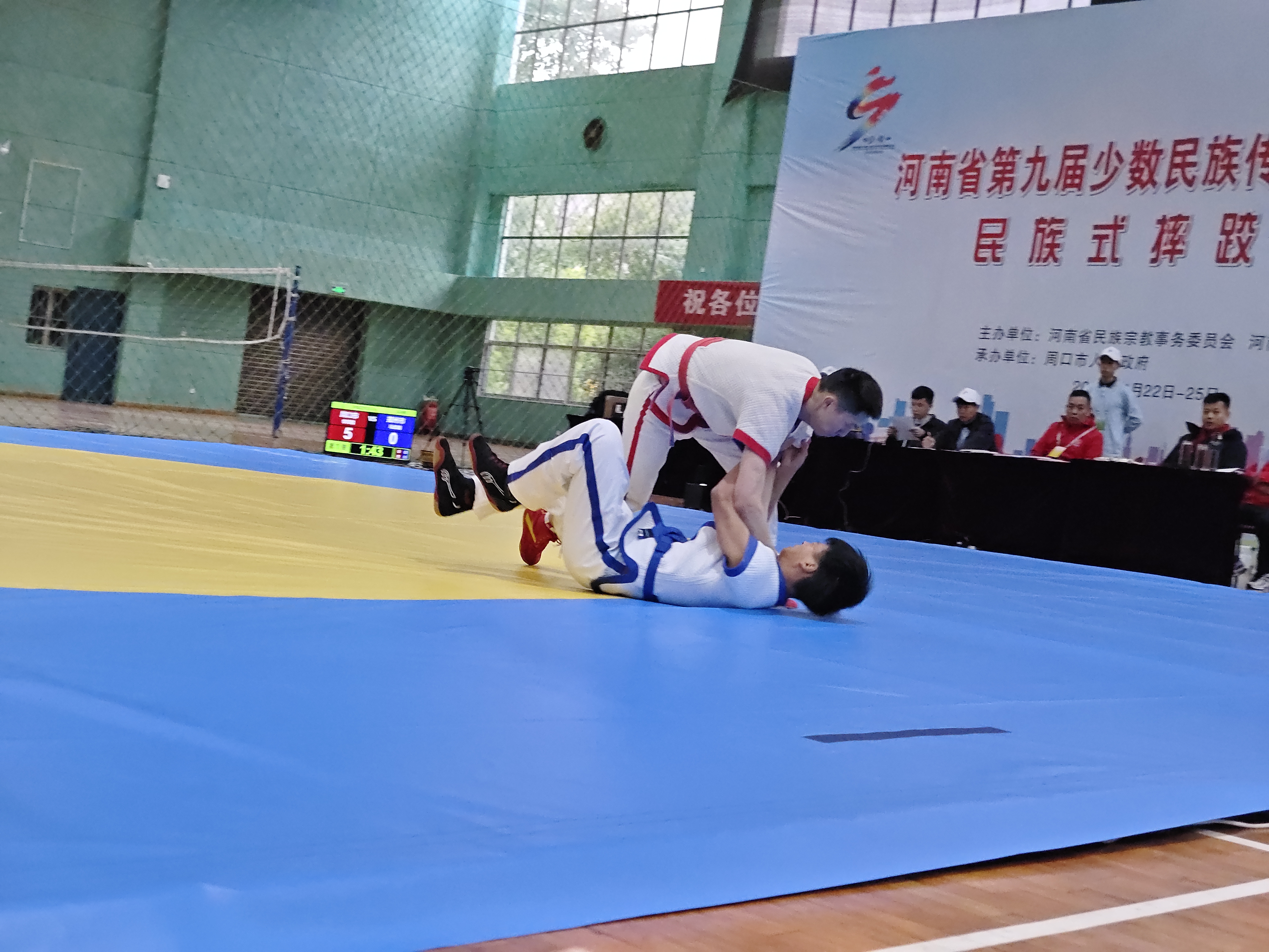 當日,河南省第九屆少數(shù)民族傳統(tǒng)體育運動會民族式摔跤競賽項目在周口師范學(xué)院老體育館開賽。絆跤是首個登場的跤種,9支代表隊參賽。該跤種以體重級別分組進行雙敗淘汰賽,共有52kg、62kg、74kg、87kg和87kg以上等5個公斤級,對應(yīng)5個一等獎。經(jīng)過激烈角逐,來自漯河市、周口市和河南大學(xué)代表隊的5名選手獲得一等獎,我市選手李祥楷、劉小濤分別獲62kg、87kg一等獎。