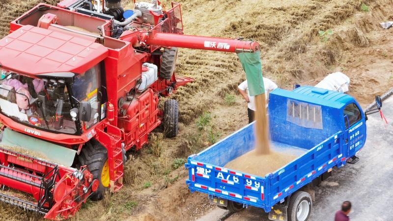 6月2日下午3時(shí)許,天空已經(jīng)陰沉下來,不時(shí)有零星小雨滴落。許灣辦事處石莊行政村村民肖士禮站在自家的地頭上,注視著收割機(jī)來來往往,機(jī)器發(fā)出隆隆的轟鳴聲,格外響亮。收割機(jī)駛過,“麥浪”逐漸消失,伴隨著收割機(jī)尾部吐出的碎末,秸稈鋪成一條條小路。滿倉后,麥粒從收割機(jī)里跳躍而出,堆起一座座小山?!笆掷镉屑Z心里不慌。順利收了,我這心也不吊著了?!毙な慷Y眉頭緊皺,旁邊陪伴著他的村干部和駐村第一書記石彥龍?jiān)谝慌暂p聲安慰。