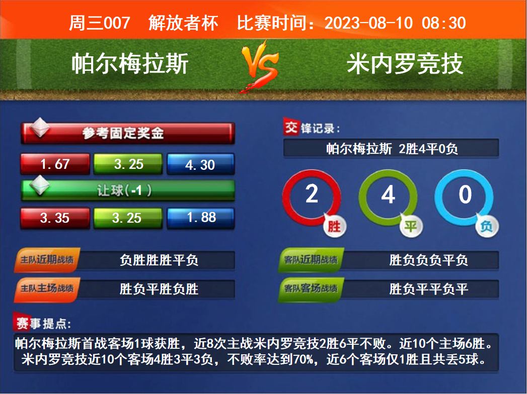 比賽時(shí)間:2023-08-10 08:30賽事提點(diǎn):帕爾梅拉斯首戰(zhàn)客場(chǎng)1球獲勝,近8次主戰(zhàn)米內(nèi)羅競(jìng)技2勝6平不敗。近10個(gè)主場(chǎng)6勝。米內(nèi)羅競(jìng)技近10個(gè)客場(chǎng)4勝3平3負(fù),不敗率達(dá)到70%,近6個(gè)客場(chǎng)僅1勝且共丟5球。
