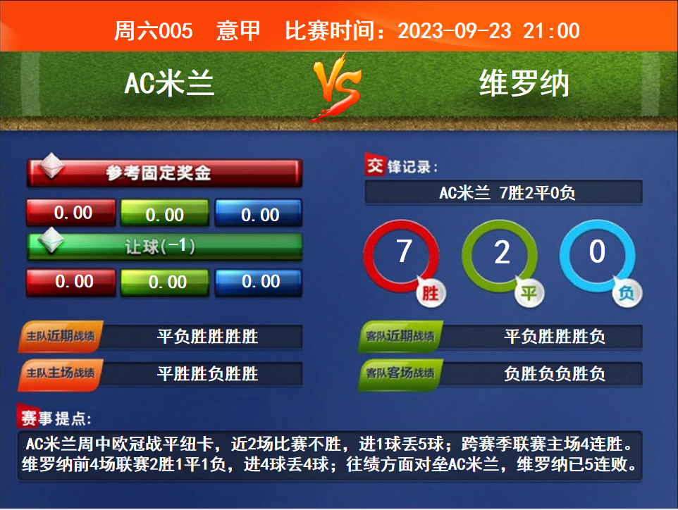 比賽時(shí)間:2023-09-23 21:00賽事提點(diǎn):AC米蘭周中歐冠戰(zhàn)平紐卡,近2場(chǎng)比賽不勝,進(jìn)1球丟5球;跨賽季聯(lián)賽主場(chǎng)4連勝。維羅納前4場(chǎng)聯(lián)賽2勝1平1負(fù),進(jìn)4球丟4球;往績(jī)方面對(duì)壘AC米蘭,維羅納已5連敗。