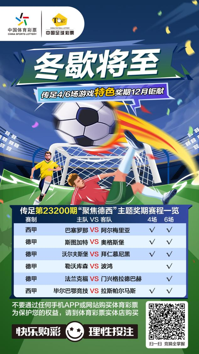 第23200期傳足特色獎(jiǎng)期已經(jīng)于12月17日20:00開(kāi)售,將于12月20日22:00停售,并于12月21日開(kāi)獎(jiǎng)。其中沃爾夫斯堡VS拜仁慕尼黑、斯圖加特VS奧格斯堡、巴塞羅那VS阿爾梅里亞和畢爾巴鄂競(jìng)技VS拉斯帕爾馬斯為4場(chǎng)進(jìn)球游戲競(jìng)猜賽事。