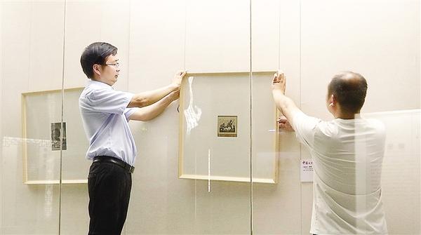 齊中華(左)和同事布置展品。記者 劉昂 攝