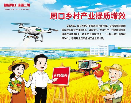 2025年,周口鄉(xiāng)村產(chǎn)業(yè)發(fā)展邁上新臺(tái)階,全市獲批創(chuàng)建國家級(jí)現(xiàn)代農(nóng)業(yè)產(chǎn)業(yè)園2個(gè)、省級(jí)9個(gè)、市級(jí)71個(gè),形成“國家級(jí)引領(lǐng)、省級(jí)支撐、市縣級(jí)補(bǔ)充”的梯次發(fā)展格局。打造國家優(yōu)勢特色產(chǎn)業(yè)集群2個(gè)、農(nóng)業(yè)產(chǎn)業(yè)強(qiáng)鎮(zhèn)21個(gè)、“一村一品”示范村鎮(zhèn)24個(gè),培育規(guī)上農(nóng)產(chǎn)品加工企業(yè)551家,形成以益海糧油、金丹乳酸、雪榮面粉為龍頭的糧食加工產(chǎn)業(yè)集群。