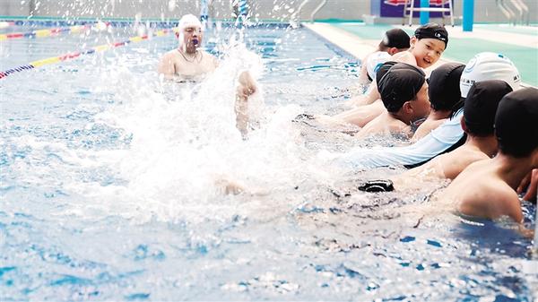 學(xué)生在教練的指導(dǎo)下進(jìn)行游泳訓(xùn)練。近日,項(xiàng)城市清華育英學(xué)校將防溺水課堂“搬”進(jìn)游泳館,開展“沉浸式”防溺水安全教育活動。