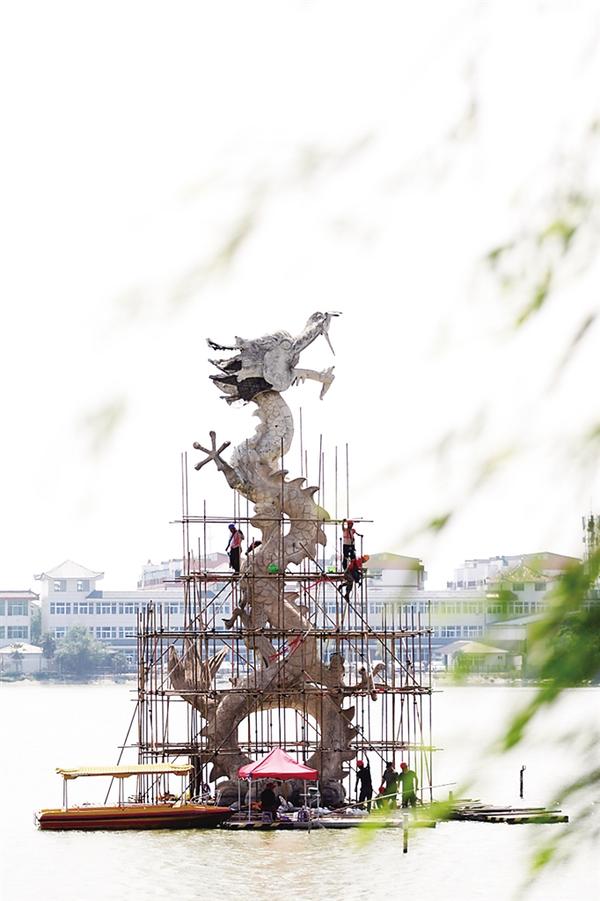 6月5日,建筑工人在搭建腳手架,開始對(duì)淮陽(yáng)龍湖中的9座龍形雕塑進(jìn)行修繕。