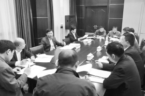 梁建松與相關(guān)單位負(fù)責(zé)同志商討縣級財(cái)政產(chǎn)業(yè)發(fā)展引導(dǎo)基金實(shí)施方案。(記者 劉俊濤 攝)